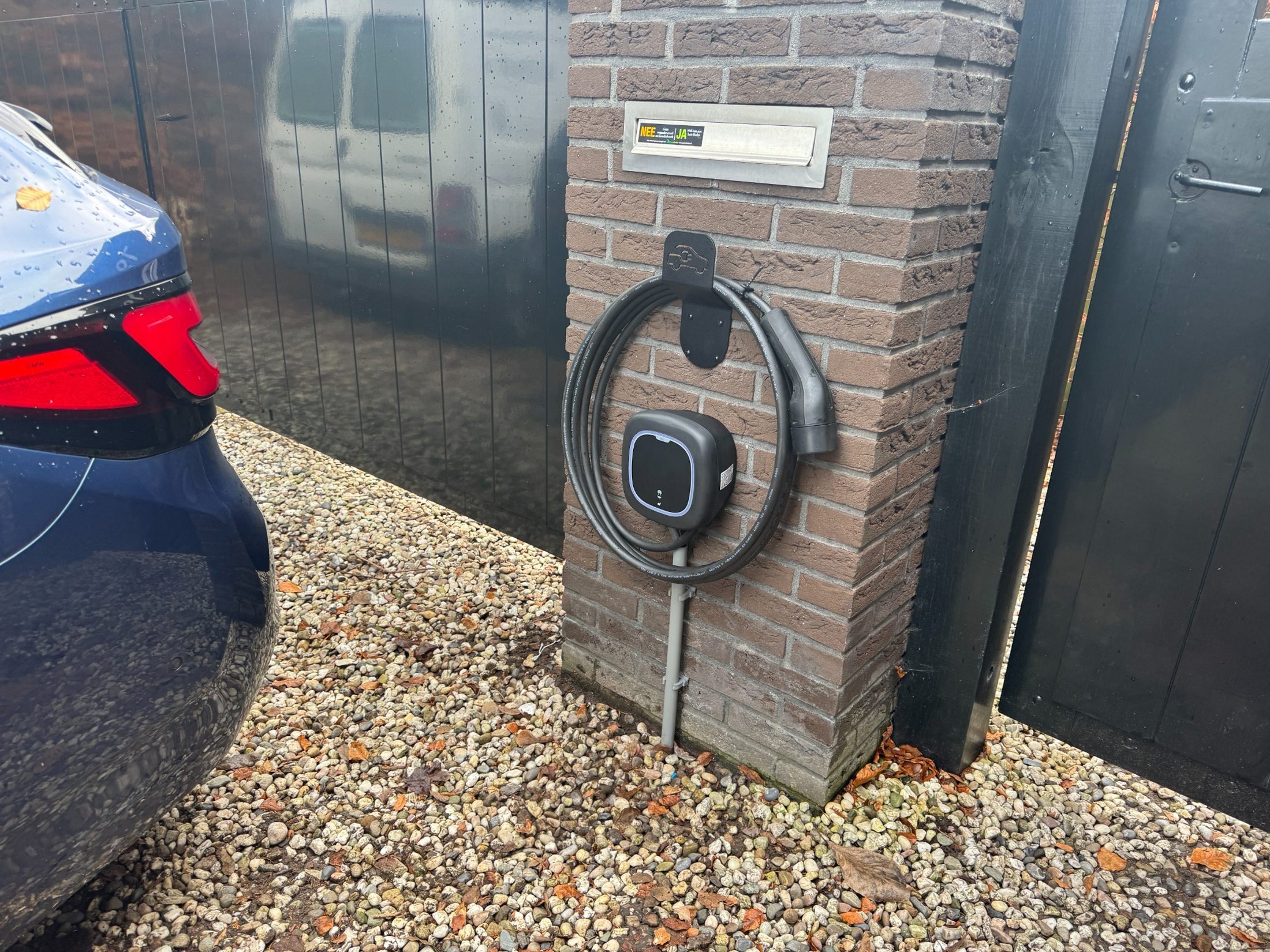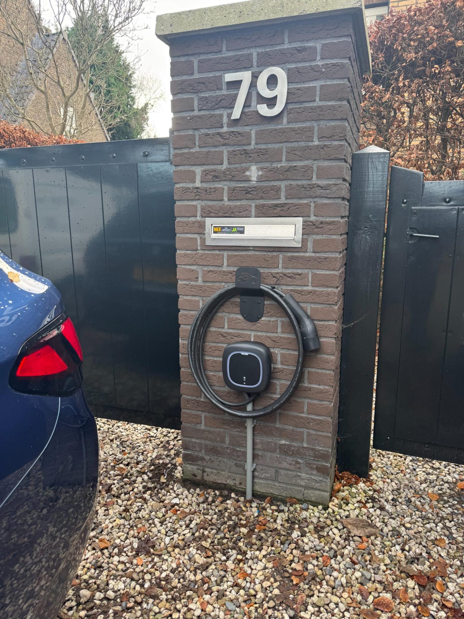 Bij deze laadpaal installatie in Hilversum is gekozen voor een Wallbox Pulsar Pro met vaste 5 meter laadkabel en RFID-functionaliteit. De Pulsar Pro is technisch geschikt voor 22 kW laden, maar in woningen met een 3x25A hoofdaansluiting wordt dit vermogen vrijwel nooit volledig benut. Daarom heb ik de laadpaal ingesteld op 11 kW in combinatie met een load balancer.